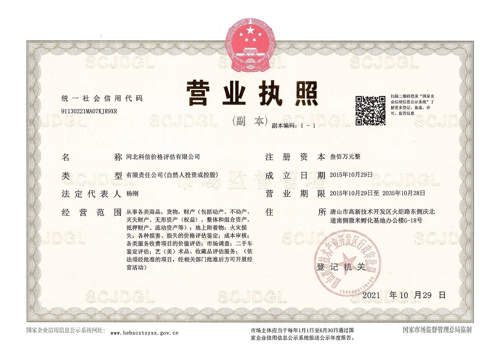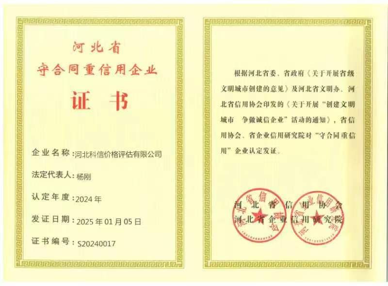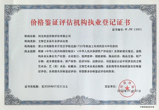 河北科信價(jià)格評估有限公司為"AAA"級信用企業(yè),具有商務(wù)部、文化部備案,頒發(fā)相關(guān)鑒定與專業(yè)評估資質(zhì),由河北省價(jià)格評估行業(yè)協(xié)會(huì)頒發(fā)的“甲級”《價(jià)格評估機(jī)構(gòu)執(zhí)業(yè)登記證書》。公司是河北省價(jià)格評估行業(yè)協(xié)會(huì)常務(wù)理事單位,河北省科技型中小企業(yè),河北省政府中介超市入冊鑒定評估機(jī)構(gòu)、唐山市政府中介超市入冊的鑒定評估機(jī)構(gòu)、唐山仲裁委員會(huì)入冊鑒定評估機(jī)構(gòu)。依法在唐山工商行政管理部門注冊登記的獨(dú)立第三方評估機(jī)構(gòu)。公司成立于2015年,注冊資金300萬元人民幣,公司擁有多名價(jià)格鑒證師、價(jià)格評估專業(yè)人員、國家高級、中級機(jī)動(dòng)車鑒定評估師、中級涉案財(cái)物評估師、汽車估損師、保險(xiǎn)公估師、高級林業(yè)工程師等,為您提供專業(yè)優(yōu)質(zhì)的服務(wù),公司嚴(yán)格按照程序組織實(shí)施鑒定評估以及合法的市場調(diào)查業(yè)務(wù),所出具的價(jià)格評估報(bào)告書、意見書具有法律效力并為國家認(rèn)可。公司自成立以來共接受河北省交警系統(tǒng)、法院系統(tǒng)、檢察院系統(tǒng)、交通局系統(tǒng)、財(cái)政系統(tǒng)、銀行系統(tǒng)以及社會(huì)各界人士的各類委托3000余件,受到一致好評。在執(zhí)業(yè)過程中,我們將依照相關(guān)的法律、法規(guī),嚴(yán)格遵循客觀、獨(dú)立、公正、公平、科學(xué)性的原則;竭誠為您提供專業(yè)、權(quán)威的價(jià)格評估服務(wù)和信息咨詢服務(wù);為您提供專業(yè)、快捷的優(yōu)質(zhì)服務(wù)。